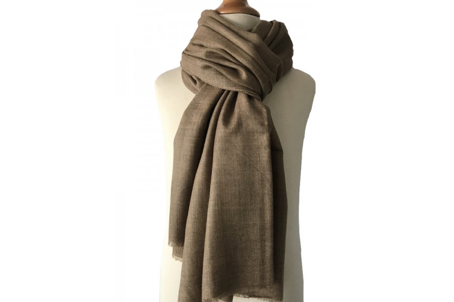 Soft, warm, elegant and refined, this superb woven scarf comes straight from the high mountains of the Himalayas. It is made of cashmere wool and comes from the high mountains of the Himalayas. In this small corner of the world are raised the little goats that produce the softest, warmest and most luxurious wool in the world, cashmere wool. This fabulous taupe coloured scarf is timeless and unisex, it will go with everything. Its style is unique, elegant, refined, contemporary and modern. If you are looking for a model that suits all styles and matches all colors of clothes, you will have to choose this soft wool pashmina of Indian cashmere. A high quality item that you will not regret and that you will keep forever. The large cashmere scarf is sent in its beautiful pouch, ready to offer.