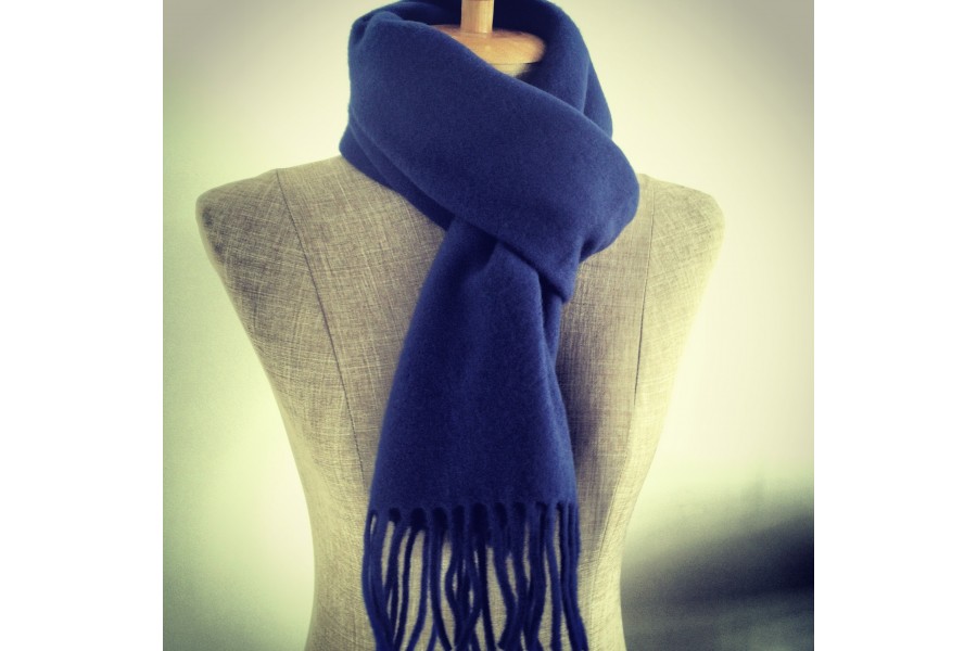 p>Superb scarf in lambswool indigo blue in 100% natural and ultra soft light and warm lamb's wool. This beautiful navy blue indigo scarf for men and women is a fabulous classic and timeless gift idea, to give or to give yourself, it is obvious that it will not be the forgotten one of your wardrobe. A luxurious black woollen scarf is the essential basic element of a winter outfit for both men and women. It will go with all your wardrobe, it will get less dirty than any other because of its color on the one hand but also the material known for its great resistance over time. If there was only one it would be her, it is obvious! Chic and fashionable, classic, timeless and timeless, a must have fashion. The large 100% lambswool scarf is sent in its beautiful pouch, ready to offer. This item is at a reduced price as it is the last items of the 2018 collection.